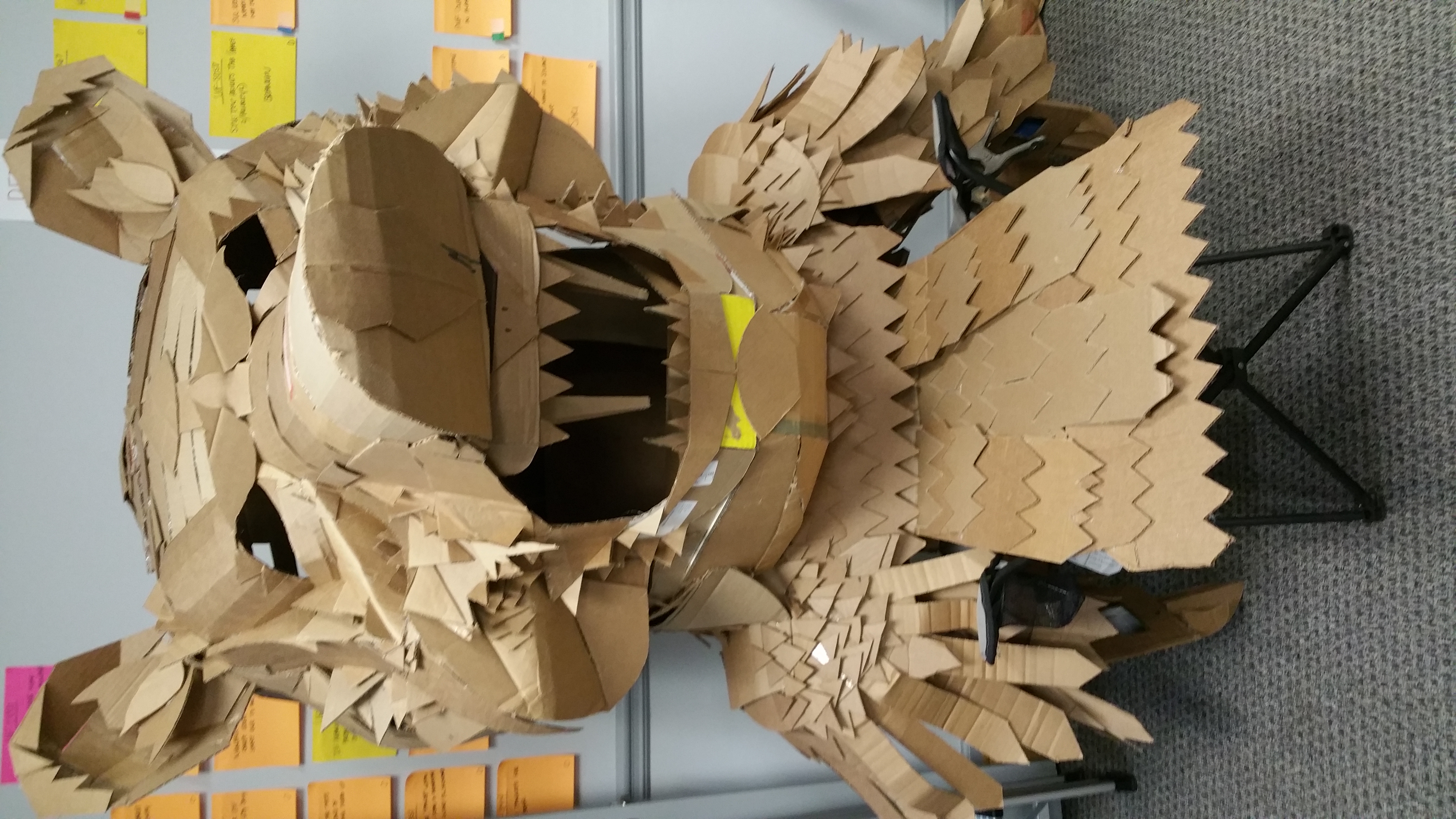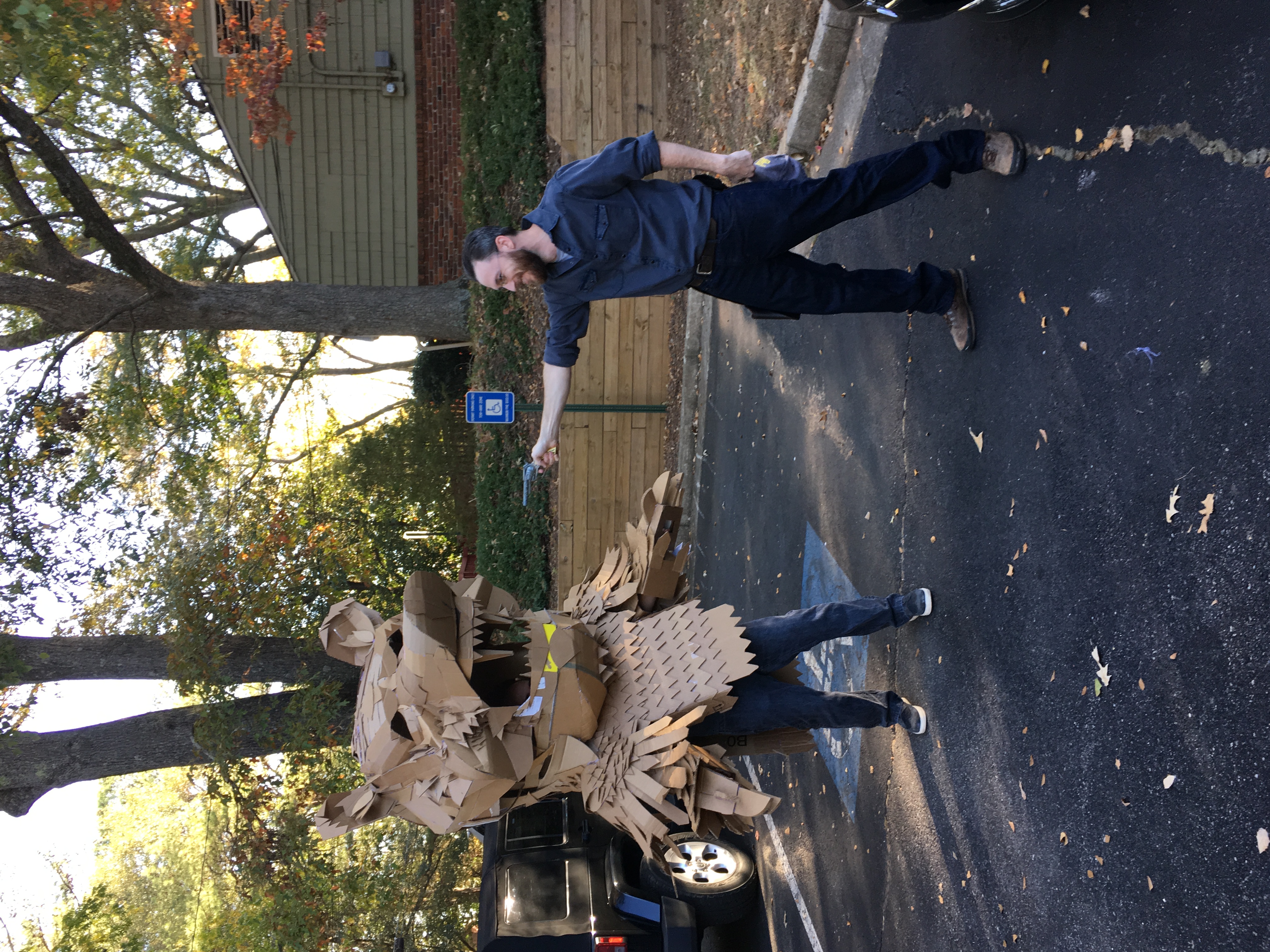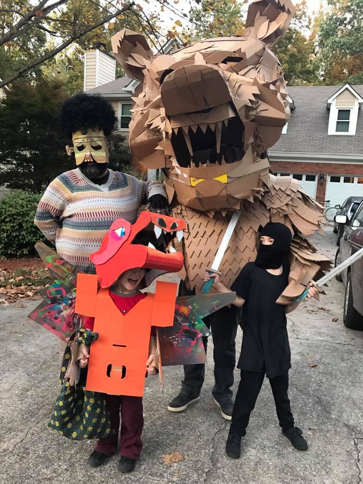 The day has come, halloween is here, and all this work is worth it. Gio has his afro cardboard frankenstein, Oscar is rocking a full cardboard Pokemon Charizard, Damien is welding a pair of custom cardboard katanas, and Alex is suited up as a cardboard bear.