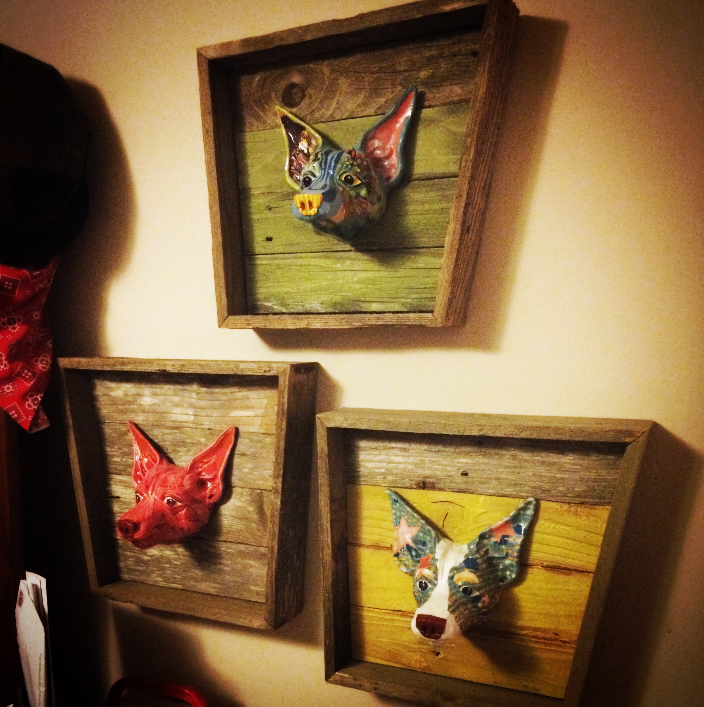 Murph stopped by yesterday He added the red one to his collection, then set me this picture. He now owns three dog heads, more info about them here. Seven heads were cast in the first run, Five have been painted, one is in LA, one is in my living room and Murph has the rest. Congratulations!