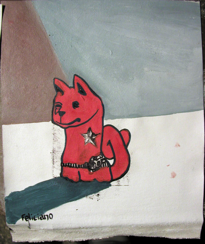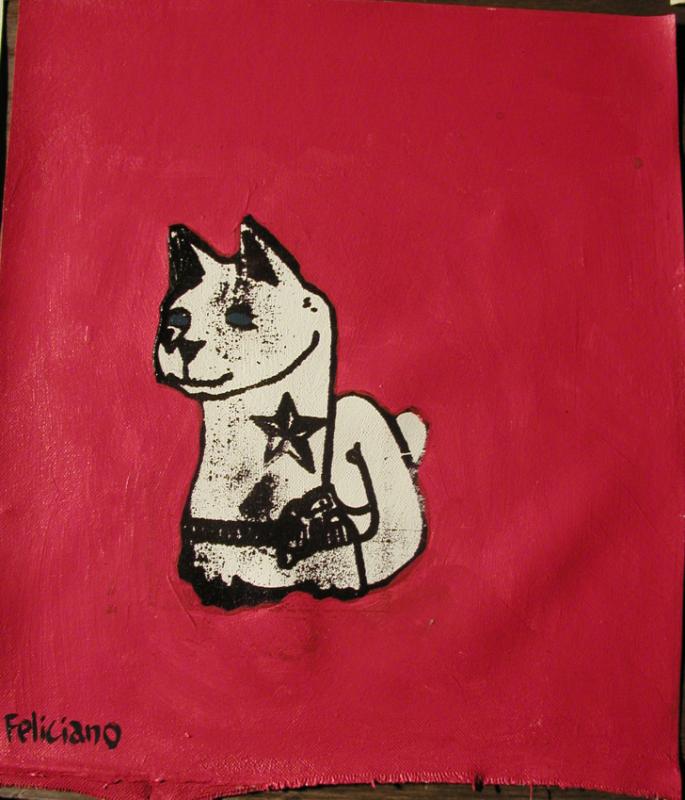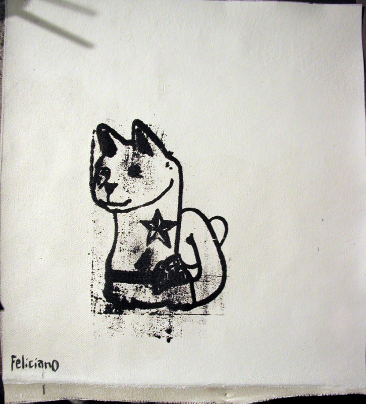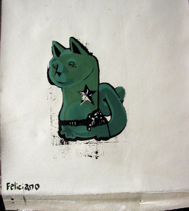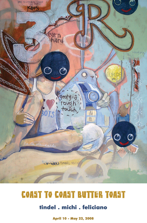 Feliciano is creating new works with Tindel, Michi, Maxwell and Kowalski, starting in 2004 when Michi and Tindel invited Feliciano to come and paint with them. In 2007 we started mailing canvases across the country from LA (Feliciano) to Atlanta (Tindel, Michi and Maxwell) this how the COAST TO COAST BUTTER TOAST show got started. April 2008 was the first show on the West coast. All five of us will regularly be showing work in Castleberry Hill, Atlanta’s historic arts district during the monthly Friday ArtStroll. Kowalski has put together a new space, MadMan Studios, above the Besharat Gallery at 175 Peters Street.